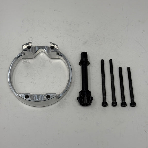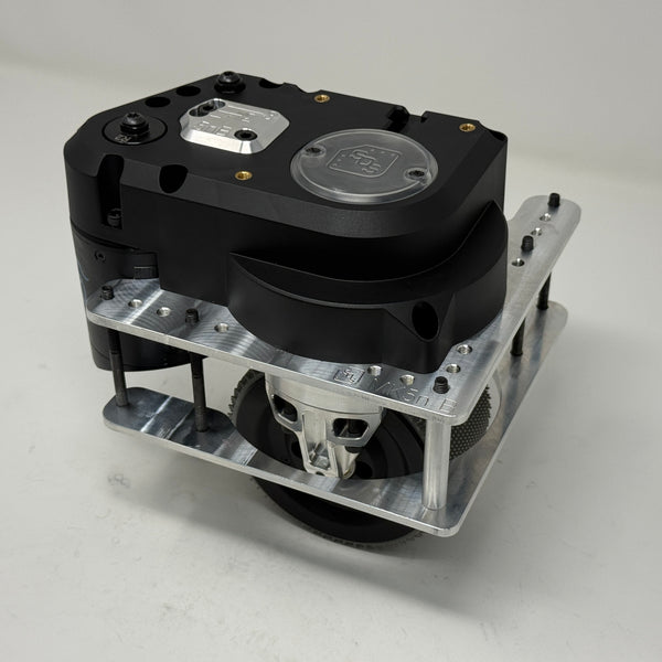The lift is accomplished by utilizing a 1" tall module riser and longer 15T bevel gear shaft. The riser is a one-piece billet component with locating features for the main steering gear and wheel mounts to ensure everything maintains proper alignment.